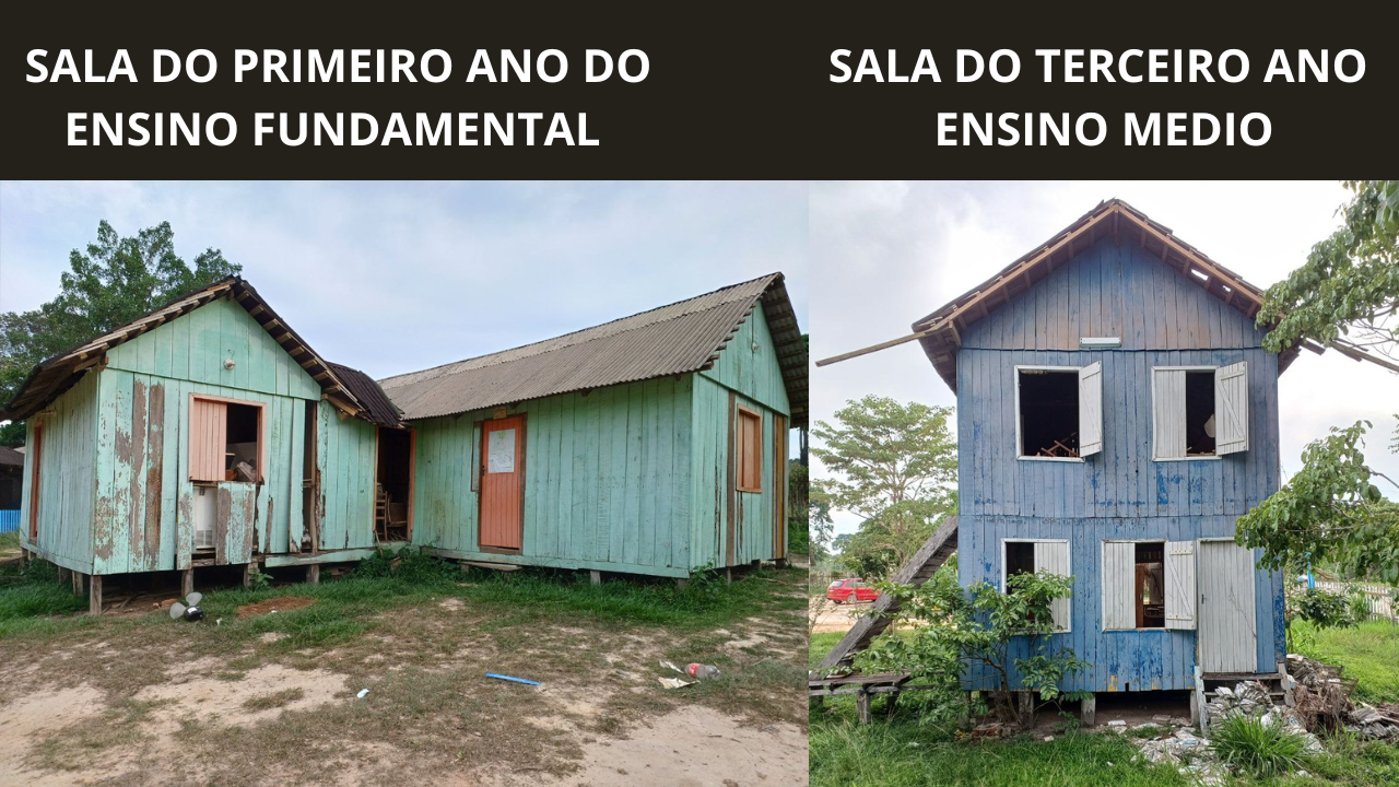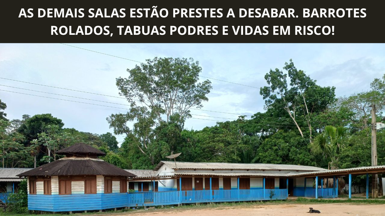 O prédio onde funcionam as aulas ameaça desabar a qualquer momento, com paredes rachadas, madeira apodrecida e o teto cedendo. Mesmo assim, as crianças continuam estudando no local, correndo risco de vida todos os dias.